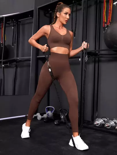 Yoga Basic Solid Backless Wideband Waist Sports Set - Coffee Brown - View 1
