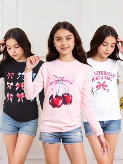 SHEIN Sparklyn 3pcs/Set Girls' Butterfly & Fruit Print Long Sleeve T-Shirts, Suitable For Street Style, Casual Wear, Classmates Gathering Chic Outfits For Autumn/Winter Fall - Pink - View 6