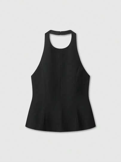 Women's Solid Color Fashion Sleeveless Halter Neck Crop Top - Black - View 1