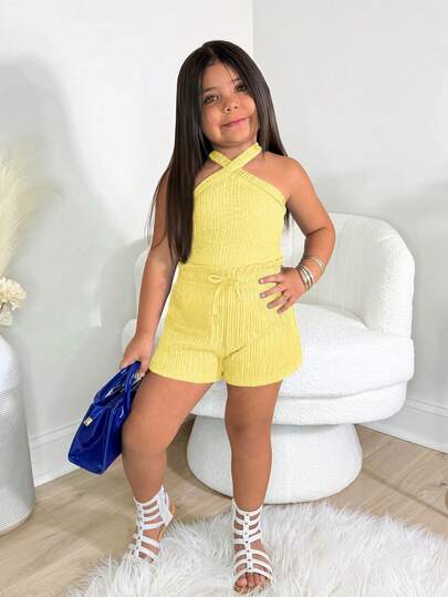 Bộ đồ bé gái màu xanh dương tươi sáng gồm áo hai dây và quần short, thích hợp cho kỳ nghỉ.