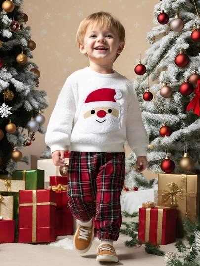 SHEIN Playful Pals Young Boy Christmas Santa Claus Graphic Fleece Sweatshirt & Plaid Pants 2-Piece Set, Suitable For Winter, Holiday, Party, Family Gathering, Home - Multicolor - View 1