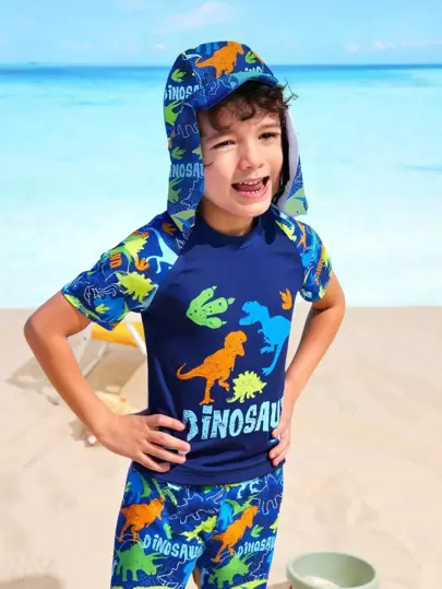 Young Boy Dinosaur Printed Swimsuit Set With Hat Boys Dinosaur Clothesboys Swim Set - Blue - View 1
