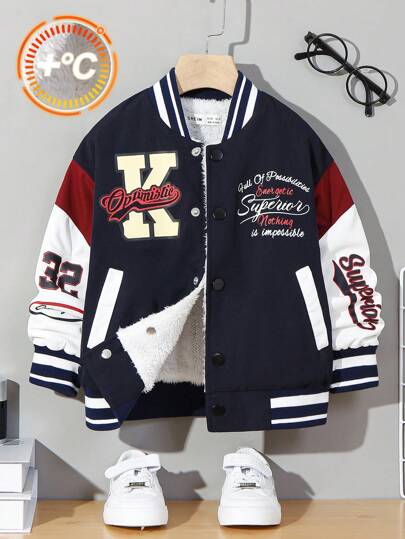 SHEIN Young Boy Letter Graphic Colorblock Teddy Lined Varsity Jacket - Multicolor - View 1