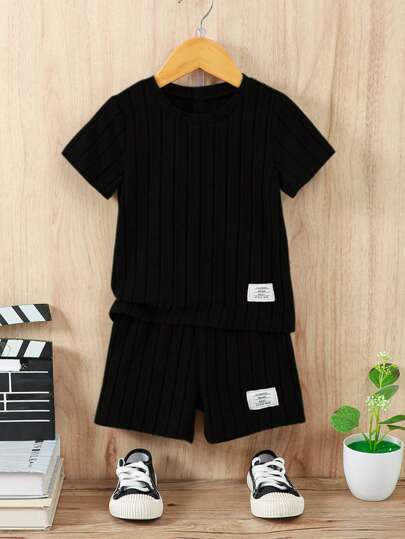 SHEIN Young Boy Letter Patched Detail Tee & Shorts Set - Black - View 1