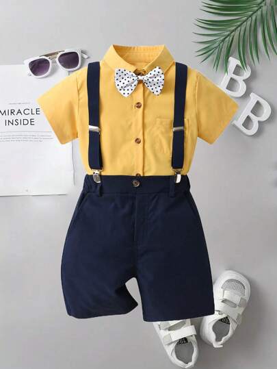 Young Boy Yellow Casual Short Sleeve Shirt With Polka Dot Bow Tie & Blue Suspender Shorts Formal Suit 4pcs/Set - Yellow - View 1