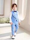 3pcs/Set Kids Boy Casual School Style Comfortable Collared Button-Up Short Sleeve Shirt, Vest, And Straight Leg Pants Suit, Gentleman Outfit, Suitable For Spring/Summer, Outings, Valentine's Day, Dates, Travel, Vacations, Family Gatherings, Back To School, Weddings, Evenings, Sports, Birthday Parties, Christenings
