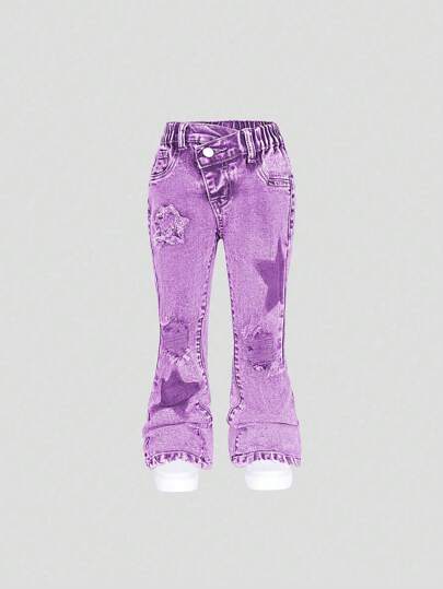 SHEIN Young Girl' Medium Wash Blue Flare Leg Distressed Jeans With Star Embroidery Patches - Purple - View 1
