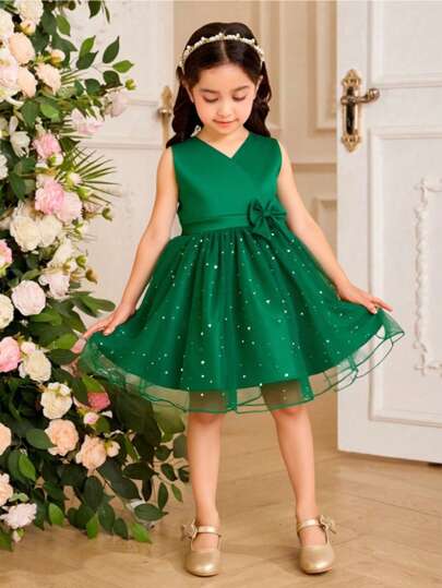 SHEIN Glamorique Kids Young Girl's Lapel Design Asymmetric Hem Star & Moon Sequin Mesh Decor Party Stain Dress, Spring/Summer - Dark Green - View 1