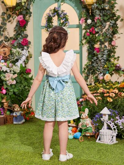 SHEIN Young Girl's Patchwork Floral Printed Ruffle Trim Decor Dress With Detachable Belt - Mint Green - View 1