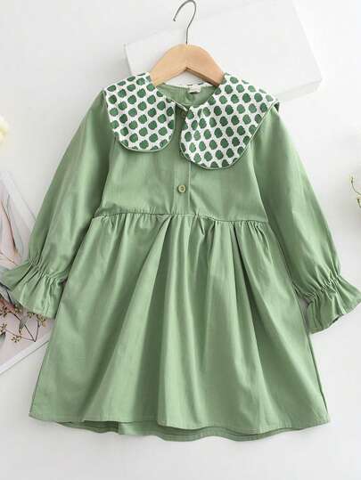 Young Girl 1Pc Chic Green Apple-Colored Solid Color Princess Dress With Big Collars - Green - View 1
