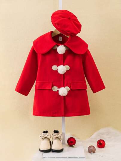 SHEIN Young Girl 1pc Peter Pan Collar Pompom Detail Overcoat & 1pc Hat - Red - View 1
