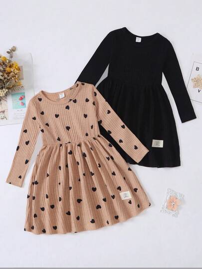 SHEIN Young Girl 2pcs Heart Print Patch Detail Dress - Multicolor - View 1
