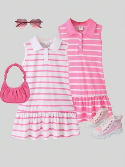 SHEIN Young Girl 2pcs Striped Print Ruffle Hem Dress Summer Holiday - Multicolor - View 1
