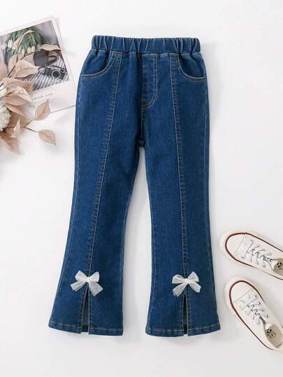 Young Girl Butterfly Decor Flared Slit Relaxed Jeans - Dark Wash - View 6