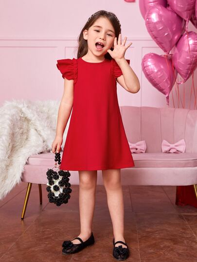 Young Girl Elegant Round Neck Puff Sleeve A-Line Knit Solid Color Dress - Red - View 1