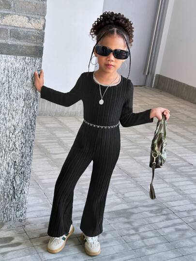 SHEIN Leap Crew Young Girl Fashion Street Style Solid Color Crew Neck Long Sleeve Fitted Jumpsuit - Black - View 1