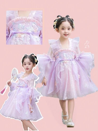 Young Girl Floral Embroidery Ruffle Trim Mesh Overlay Gown Hanfu Dress - Pink - View 1