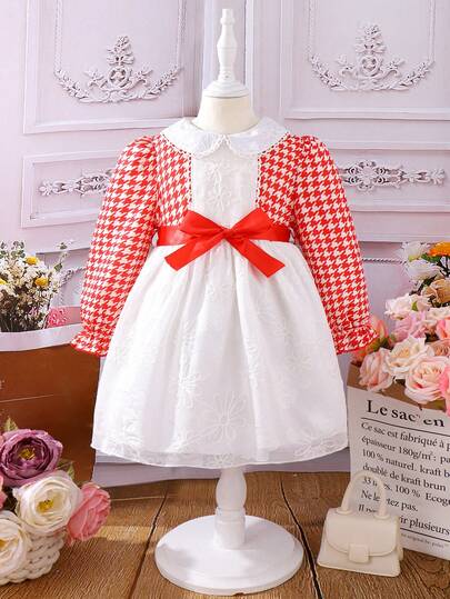 SHEIN Young Girl Houndstooth Print Peter Pan Collar Flare Sleeve Belted Dress - Multicolor - View 1