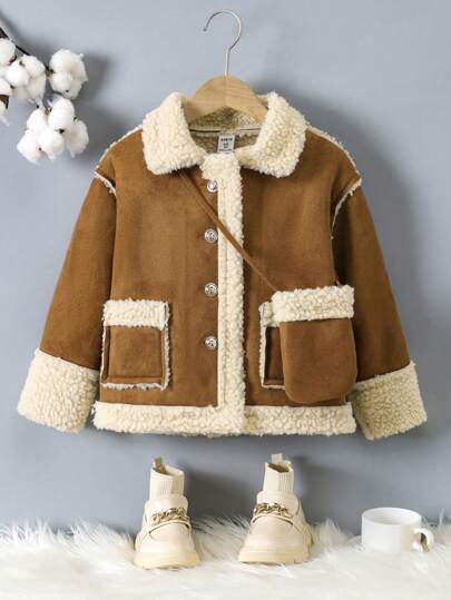 SHEIN Young Girl Khaki Fluffy Jacket + Versatile Casual Tote Bag, Pair With Pants Or Skirt, Suitable For Daily Wear And Outings - Khaki - View 1