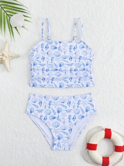 Young Girl Marine Life Print Adjustable Straps Tankini Swimsuit Set - White - View 1