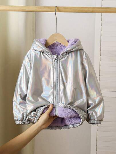 Young Girl Shiny Reflective Silver Jacket,Soft Purple Thermal Lined Provides Extra Warmth And Comfort. - Pink - View 1