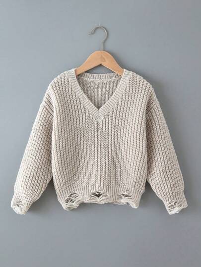 SHEIN Young Girl Solid Color V-Neck Dropped Shoulder Long Sleeve Distressed Street-Style Sweater, Autumn/Winter - Light Grey - View 1