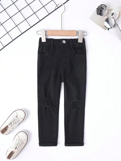 Young Girl Solid Ripped Straight Leg Jeans - Black - View 1