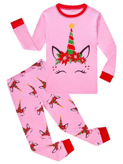 Young Girl Unicorn Print Tee & Pants PJ Set - Pink - View 1