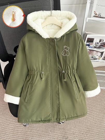 Young Girl' Winter Thermal Lined Hooded Sweatshirt With Cartoon Bear Embroidery, Waist Drawstring, Slim Fit - Army Green - View 1