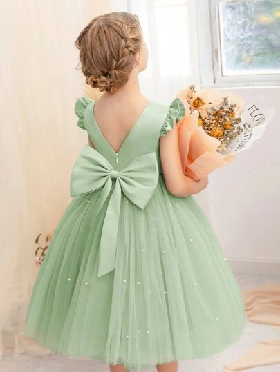 5. Young Girl's Ruffled Mesh Decorated Party Dress, Elegant Princess Gown Suitable For Birthday Party, Valentine's Day, Prom, Casual Everyday Wear, Musical Instrument Performance, Stage Show Flower Child Thanksgiving Dress Graduation