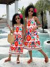 Đầm chữ A hai dây in hoa mùa hè cho bé gái, màu kem chủ đạo với họa tiết hoa rực rỡ, dây đeo mảnh, dáng suông thướt tha, thiết kế hoa văn dân gian Bohemian, chất liệu nhẹ, thích hợp cho mùa hè đi biển/nghỉ lễ.