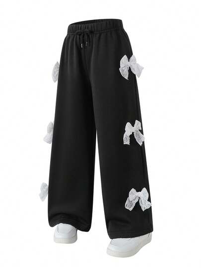 Young Girls Casual Lace Bow Knot Wide-Leg Pants, Sportswear Pants With Bows Bow Pants Lace Bow Pants Kawaii Pants Cute Pants - Black - View 1