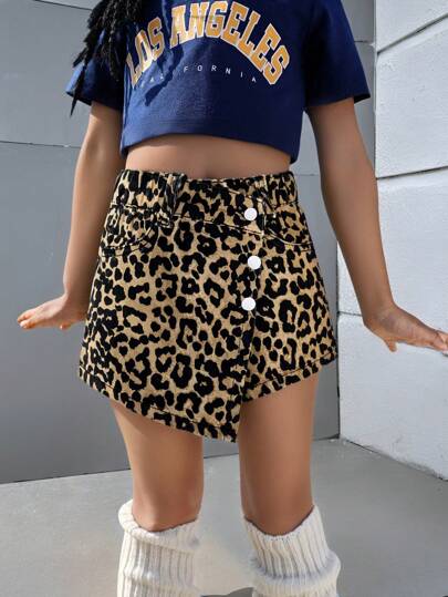Young Girls Fashionable Leopard Pattern Washed Denim Skort Summer Holiday - Khaki - View 1