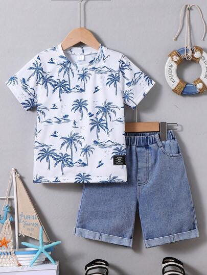 Young Boy Summer Holiday Coconut Tree Pattern Printed Short Sleeve T-Shirt And Denim Shorts Set - White - View 1
