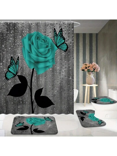 4pcs Garden Roses Bathroom Accessory Sets With Rugs For Bathroom Decor, Drops Water Flower Beautiful Glass Abstract Nature Spring Love Theme, Includes Toilet Lid Cover And U-Shaped Rugs, Curtains For Bathroom - 70.8in*70.8in - View 1