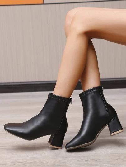Zip Back Chunky Heeled Boots - Black - View 1