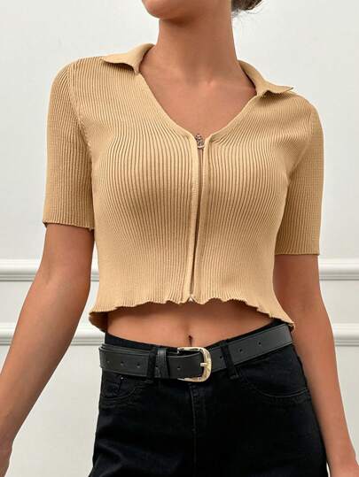 EURMUSE Zip Up Ribbed Knit Crop Cardigan - Camel - View 1