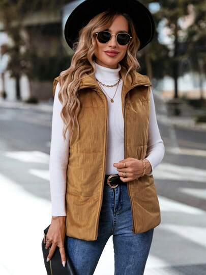 SHEIN LUNE Zip Up Sleeveless  Vest Coat - Brown - View 1