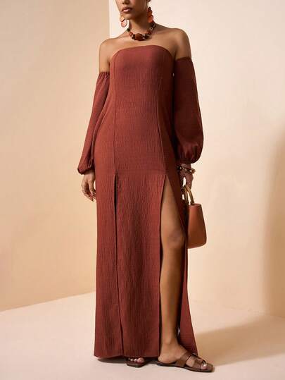 Zivah 2026 Spring/Summer New Arrival Music Festival, Easter, St. Patrick's Day, Valentine's Day, Date, Western, Nomadic, Birthday Party, Graduation, College Style, Student, Daily Casual, Basic Versatile, Leisure, Vacation, Cruise Travel, Beach, Sunbathing, Viral , Streetwear, Wedding Guest Boho, Commute, Brunch, Airport, Party, Holiday Outing, Office Wear, Loose Strapless Long Sleeve Detachable Two-Way Long Linen Textured Brown Maxi Dress - Brown - View 1