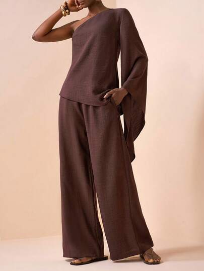 Zivah 2026 Spring/Summer New Valentine's Day Party Wedding Evening Date Casual Wear Student Daily Wear Basic Versatile Casual Vacation Cruise Travel Beach Sunbathing Viral Hit Elegant Commute Business Casual One-Shoulder Asymmetric Hem Bell Sleeve Top + Wide Leg Pants With Real Pockets, Spring/Summer 2-Piece Set, Deep Brown Bamboo Texture Set, Casual Set, Elegant Set, Women's 2-Piece Outfit - Mocha Brown - View 1