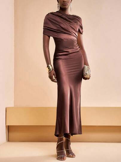 Zivah The New Autumn And Winter Wedding Season Valentine's Day Collection Is Suitable For Daily Dates, Commutes, Business, Ladylike, Elegant, Cruise Parties, Simplicity, Popular Online , Birthday Banquets, High-End Parties, Cocktail Dresses, Muslim-Style Sweet Round-Neck Wraparound Sleeves Long Dress, Brown Shiny Satin Women's Long Dress -A - Brown - View 1