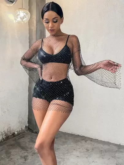 Zolique Drop Shoulder Fishing Net Rhinestone Sheer Top Without Lingerie Fall Cloth For Women - Black - View 1