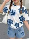 Bộ 6 món thời trang thường ngày mùa xuân hè cho bé gái, sáng tạo, cá tính, tươi mới, dễ thương, tối giản, màu đen bóng và hồng, họa tiết nơ vương miện, áo thun và quần short in hình, thoải mái để mặc hàng ngày, phong cách mùa hè ấm áp phù hợp cho bé gái.