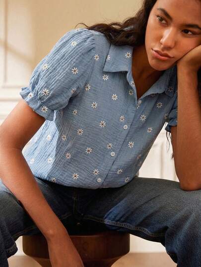 Áo kiểu tay ngắn dáng rộng thêu họa tiết kiểu Pháp cổ điển, thời trang và thanh lịch, phù hợp cho các bạn nữ trẻ vào mùa xuân/hè.