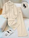 EMERY ROSE Women's Fashion Casual Solid Color Embroidered Hooded Pocket Zipper Long Sleeve Loose Sweatshirt And Embroidered High Waist Drawstring Loose Straight Sweatpants Set, Suitable For Daily, Sports And Leisure Wear