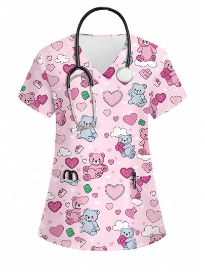 PopScrub Cartoon Bear & Heart Print Short Sleeve Nurse Scrub Top, For Women - Multicolor - View 1