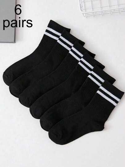 6 Pairs Minimalist Black & White Striped Unisex Mid-Calf Socks, Casual Versatile Socks For All Seasons - Multicolor - View 1