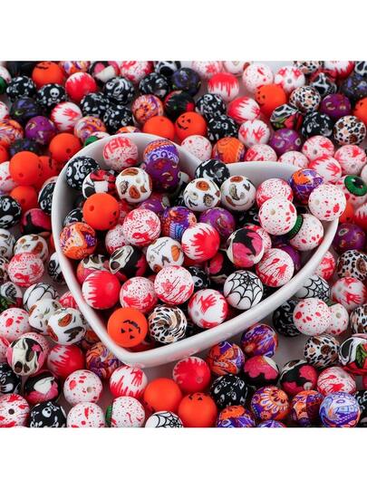 15pcs, Halloween Themed Printed Silicone Beads, Skull, Pumpkin And Other Patterns, Suitable For DIY Jewelry Making, Keychains, Bracelets, Hanging Ropes And Pen Beads, Keychain Making Materials, - Multicolor - View 15