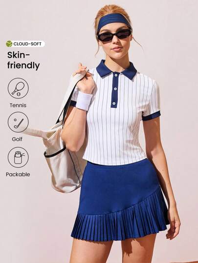 CourtClass Women's Slim Fit Striped Print Sports Polo Shirt For Tennis & Outdoor Exercise Women Golf Tops Women Polo Shirts Women Tennis Tops Striped Polo Shirt Athletic Tops For Women - Multicolor - View 1