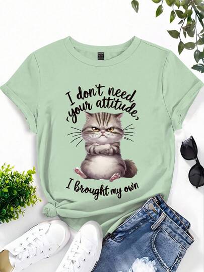 INAWLY Casual Cat Slogan Print Short Sleeve T-Shirt For Summer - Green - View 1